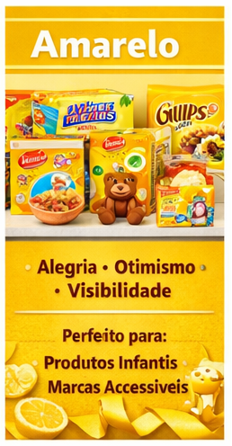 É uma escolha frequente para produtos voltados ao público infantil ou marcas que desejam transmitir leveza e proximidade. Além disso, o amarelo reforça uma comunicação emocional positiva e acessível.