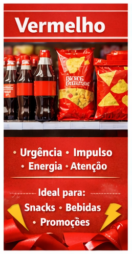 Por esse motivo, rótulos e embalagens vermelhas são muito utilizados em produtos de compra por impulso, como alimentos, bebidas e snacks. Além disso, essa cor cria uma sensação de urgência, estimulando decisões rápidas de compra.