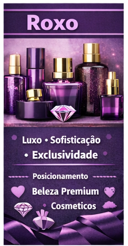 O roxo é associado à sofisticação, prestígio e luxo. No design de embalagens, é comum em produtos de beleza, cosméticos premium e linhas antienvelhecimento.